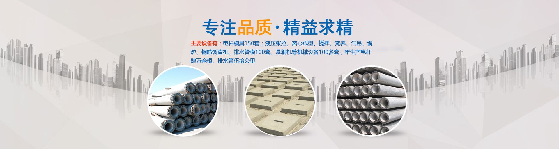 公司主要生產(chǎn)ф100—ф430環(huán)形預應力混凝土電桿和ф190—ф550環(huán)形鋼筋混凝土電桿,以及ф300—ф1000排水管,主要設備有:電桿模具180套;液壓張拉、離心成型、攪拌、蒸養(yǎng)、汽吊、鍋爐、鋼筋調(diào)直機、滾焊機、排水管模100套、懸輥機等機械設備100多套,年生產(chǎn)電桿肆萬余根、排水管伍拾公里。……